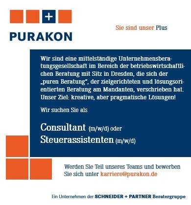 Wir suchen engagierte Mitarbeiter, die mit uns gemeinsam die Zukunft der PURAKON Unternehmensberatung GmbH gestalten. Dabei stellen wir hohe Anforderungen an die Qualifikation unserer Mitarbeiter. Selbstständiges Arbeiten, Mandantenorientierung und die Bereitschaft zur laufenden Fortbildung sind die Grundvoraussetzungen für eine erfolgreiche Tätigkeit in unserem Team.